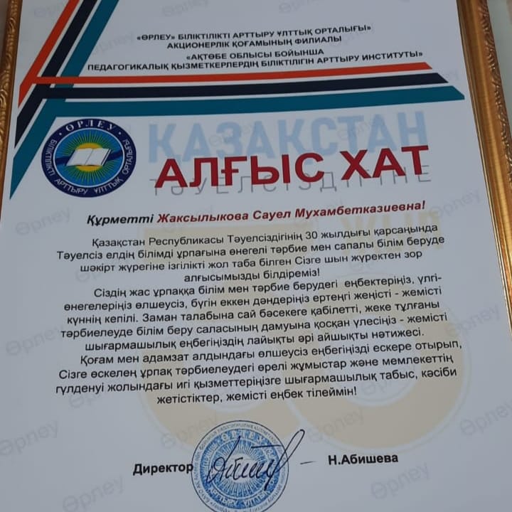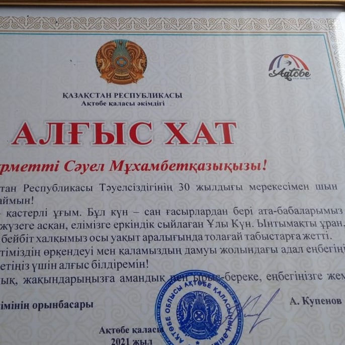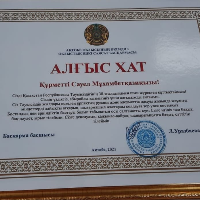 Сауел Мұхамбетказиқызы, Сіздің еліміздің Тәуелсіздігіміздің 30жылдық мерекесі күніне орай алған марапаттарыңызбен шын жүректен құттықтаймыз!