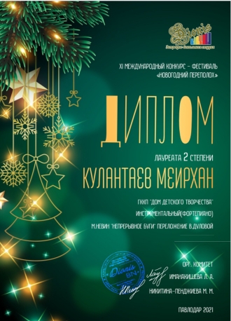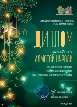 Жаңа жыл қарсаңында фортепиано класы бойынша,«Новогодний переполох» ХI халықаралық байқауына қатысып, жеңімпаз атанған оқушыларымыз Қулантаев Мейрхан,Алматай Нұрали және жетекшісі Татьяна Анатольевнаны шын жүректен құттықтаймыз!