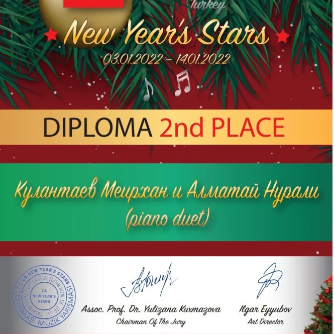 Түркі елінде өткен халықаралық онлайн «New Year*s Stars» байқауында жас таланттарымыз дуэт болып қатысқан Алматай Нурали және Кунанбаев Меирхан 2 орын иегері атанды. Жетекшісі Татьяна Габитова аталған байқауға оқушыларды қатысуына дайындаған және әділ қазы мүшесі болғаны үшін марапатталды. Құттықтаймыз!