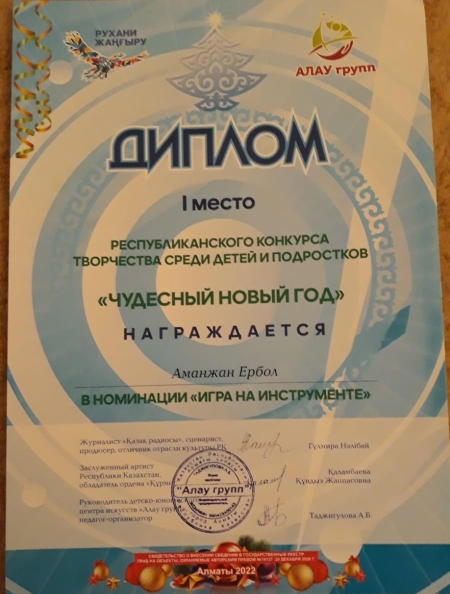 «Чудесный новый год» атты Республикалық жасөспірімдер мен балалар байқауында жас ерекшелігі бойынша «аспапта ойнау» номинациясы бойынша Аманжан Ербол 1орын иегері атанды.