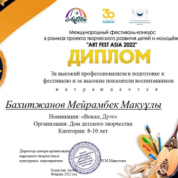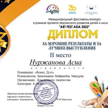 Нуржанова Асиа 2 орын иеленді және оқушылардың талантын жоғары деңгейде дамытқаны үшін жетекшісі Бахитжанов М.М дипломмен марпатталды. Жұлдыздарың биіктерден көріне берсін демекпіз!