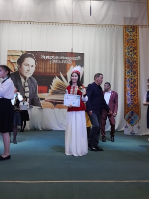 М.Мақатаев шығармашылығына арналған қалалық байқауда көркем сөз үйірмесінің қатысушылары, өз жас еркешеліктері бойынша Тұяқова Сәнім - Бас жүлде иегері,