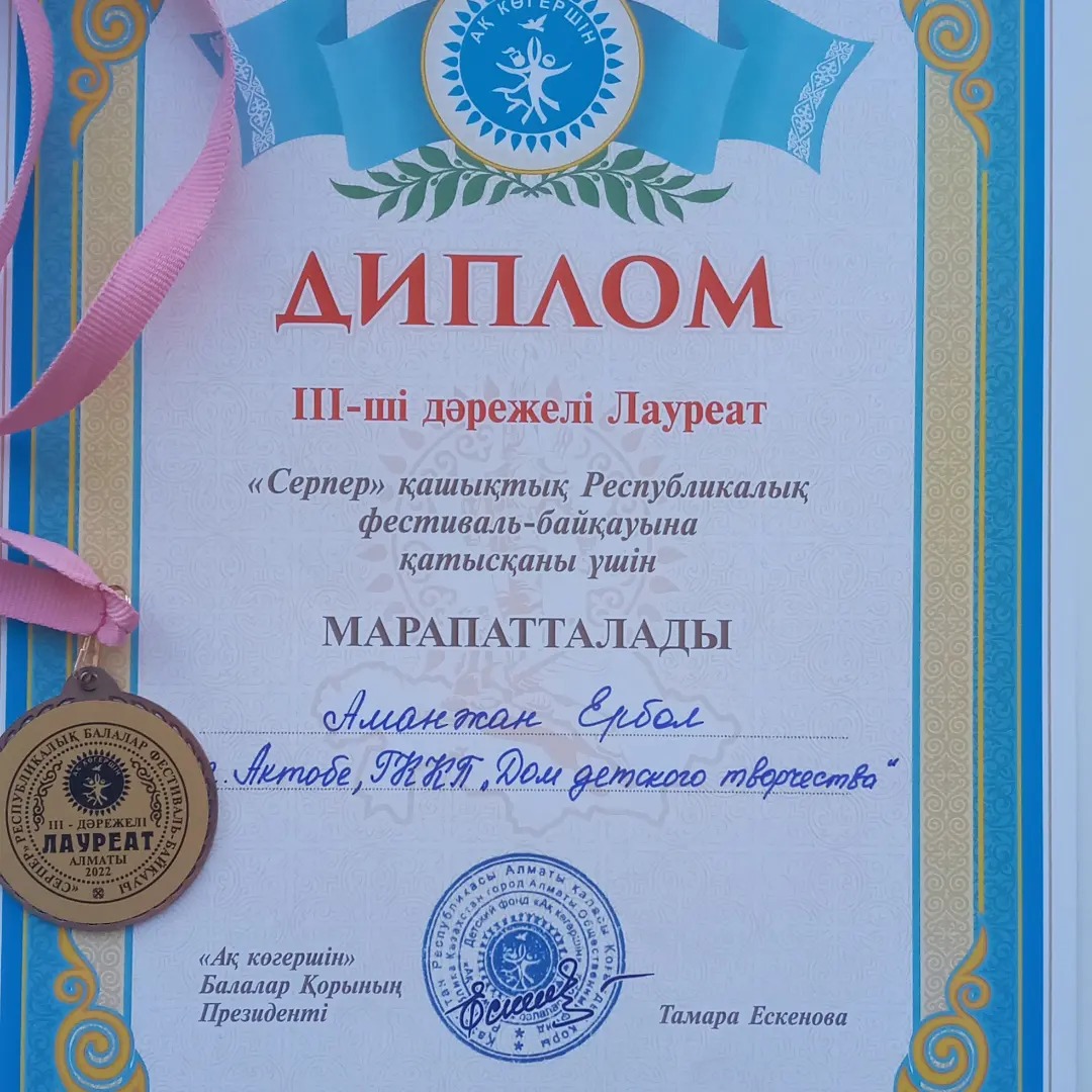 Балалар шығармашылық үйі МКҚК фортепиано үйірмесінің оқушысы Аманжан Ербол «Серпер» Республикалық қашықтық байқауында III орын иегері атанды.