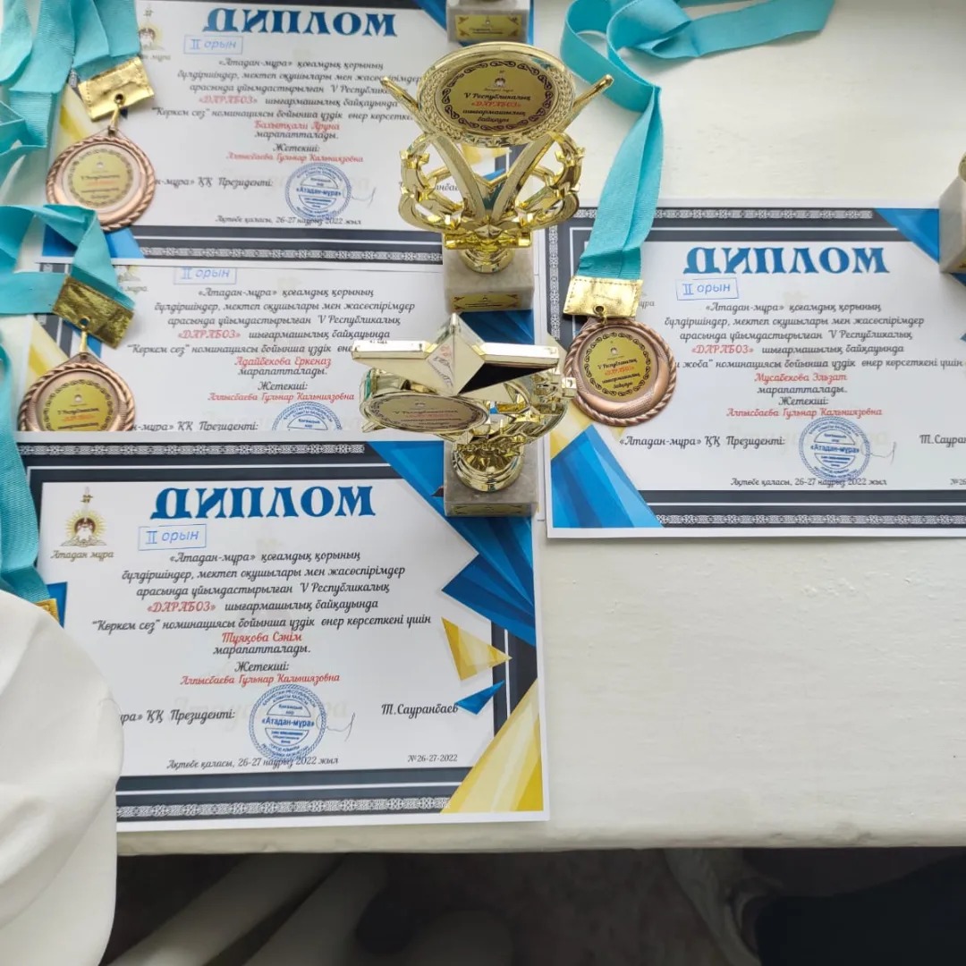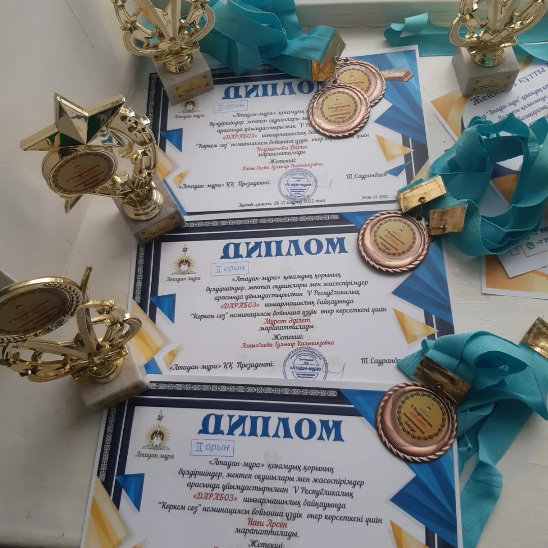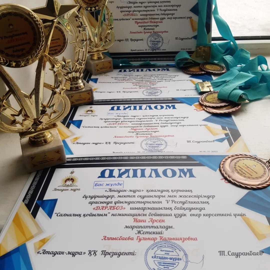 «Атадан-мұра» қоғамдық қорының бүлдіршіндер мектеп оқушылары мен жасөспірімдер арасында ұйымдастырылған V Республикалық «Дарабоз» шығармашылық байқауында,Балалар шығармашылық үйінің актерлік шеберлік және көркем сөз үйірмелерінің оқушылары жүлделі жеңістерімен қоржындарын толқынды,сонымен бірге алдағы байқауларға жолдама жеңіп алды.