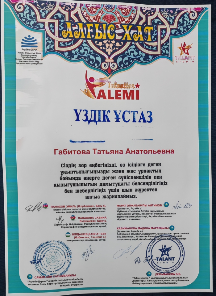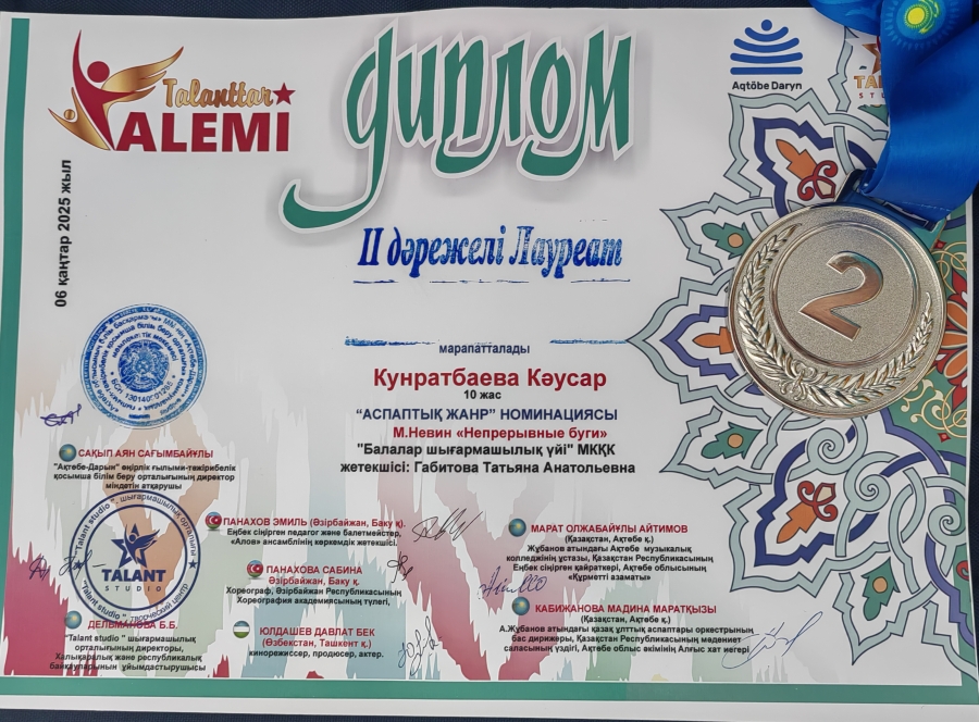 Ташкентте өткен "Таланттар әлемі" халықаралық байқауда "Аспаптық жанр" номинация бойынша Кунтратбаева Кәусар 2 орын иегері атанды.