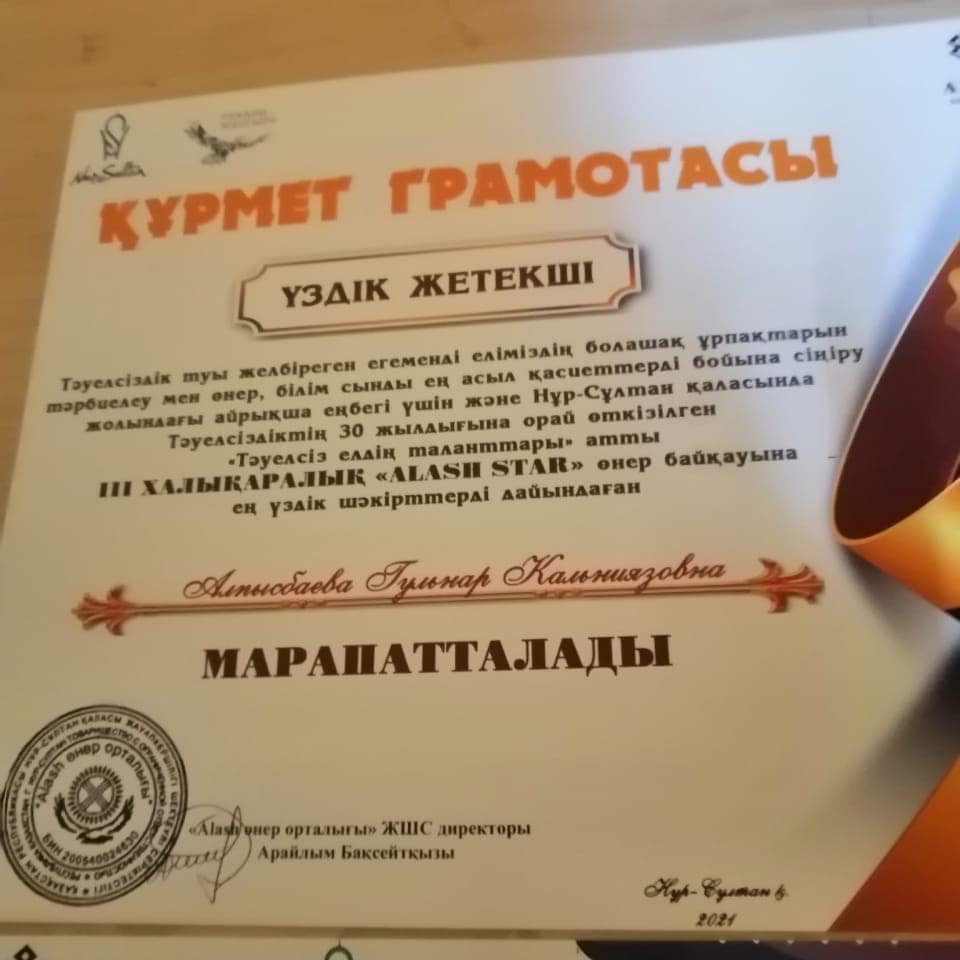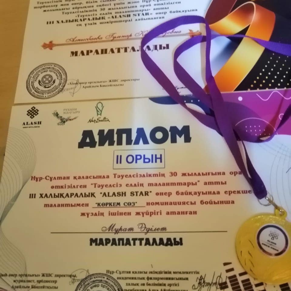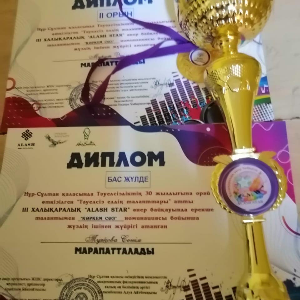 Нұрсұлтан қаласында өткен Қазақстан Республикасының 30жылдығына орай «Тәуелсіз елдің таланттары» атты III Халықаралық «ALASH STAR» байқауында талантты оқушыларымыз Тұяқова Сәнім Бас жүлде, Мұрат Әділет 2орын иеленді. Жетекшісі Алпысбаева Гульнар Кальниязовна.