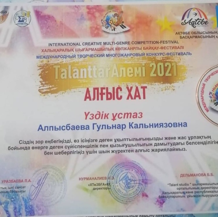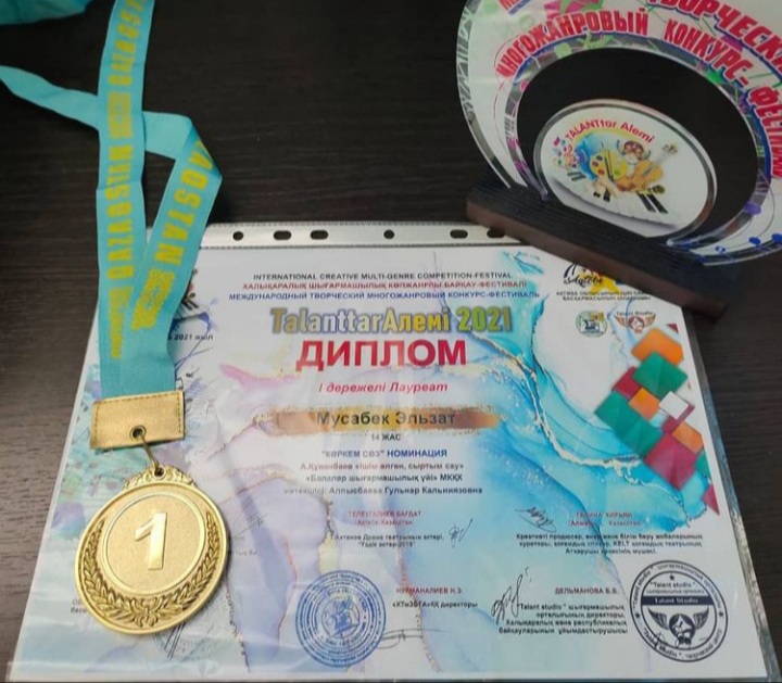 «Көркемсөз» номинациясы бойынша I дәрежелі лауреат Мусабек Эльзат және жетекшісі «Үздік ұстаз» номинациясы бойынша Алпысбаева Гульнар Кальниязовнаны жеңістерімен
