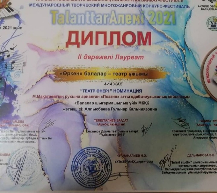 «Театр өнері» номинациясы бойынша II дәрежелі лауреат «Өркен» балалар театр ұжымы,