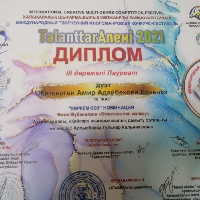 III дәрежелі лауреат Жеткерген Амир және Адайбекова Еркеназ,